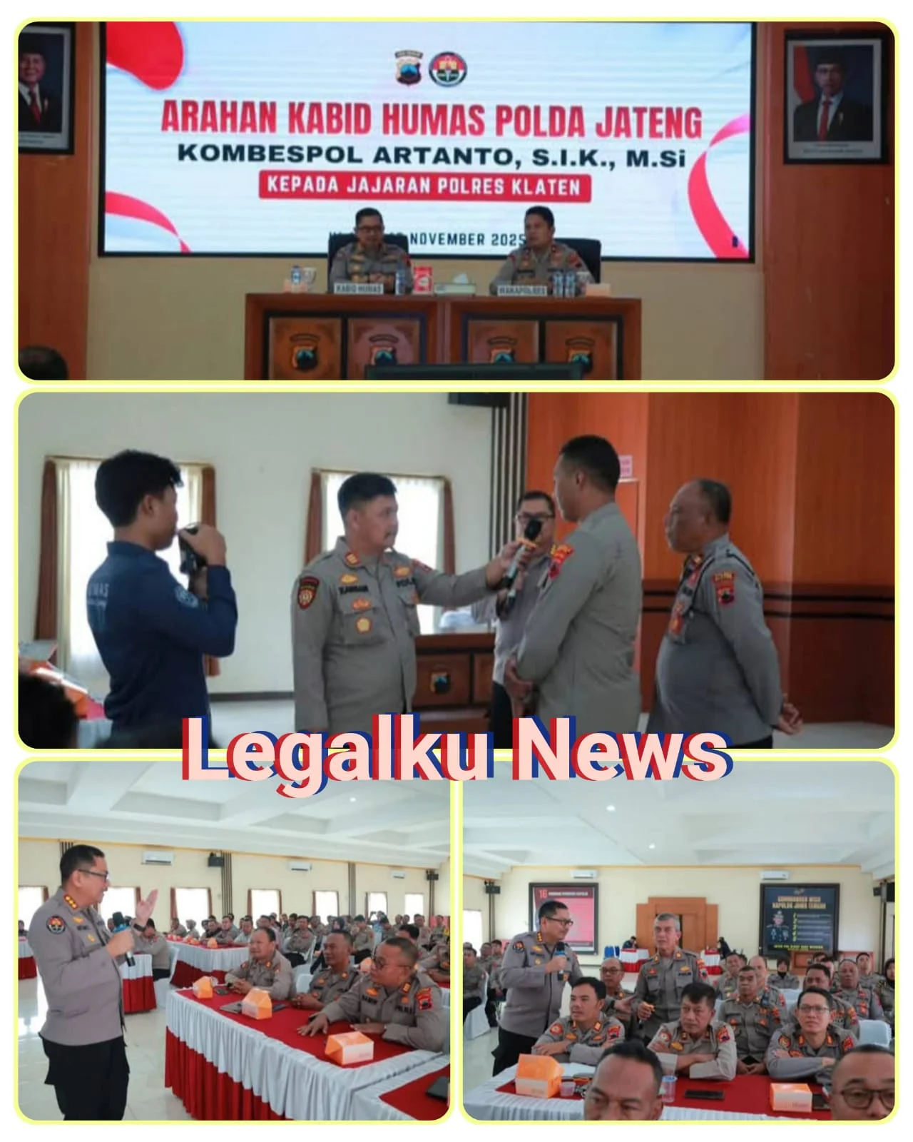Klaten, Legalku News.Com|| Polda jateng – Polres Klaten – Perkembangan dinamika tugas di lapangan menuntut Polri tidak hanya sigap dalam melayani masyarakat, tetapi juga harus memiliki keterampilan dalam berkomunikasi. Hal ini jadi pesan utama yang disampaikan Kabid Humas Polda Jawa Tengah Kombes Pol. Artanto, S.I.K., M.Si., saat memberikan arahan kepada jajaran Polres Klaten, pada Kamis (13/11/2025).